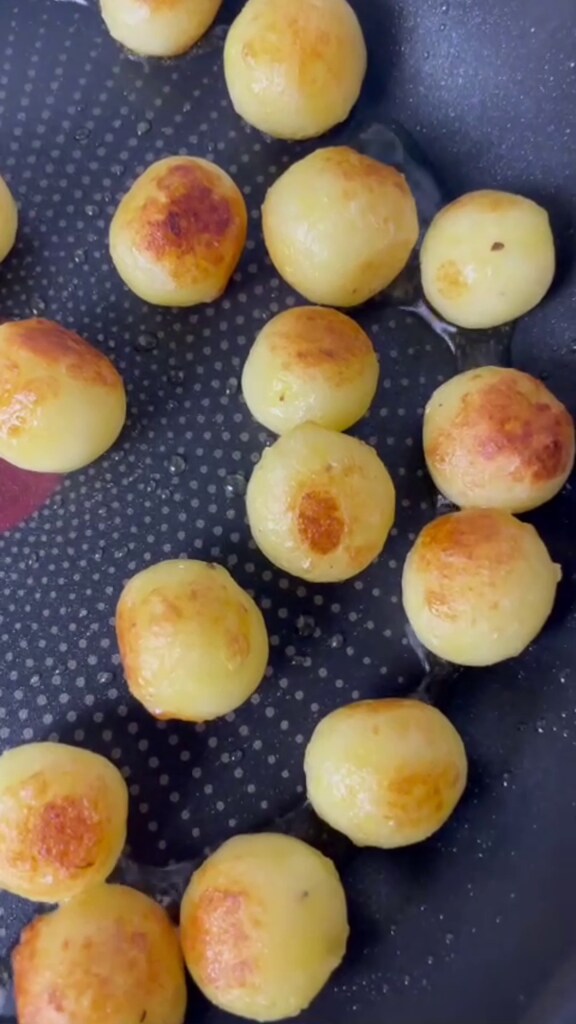 Façonnez de nombreuses petites boules comme vous le feriez avec des boulettes.Faites cuire les bonbons de pommes de terre dans une poêle avec un peu d’huile de graines d’arachide pendant environ 5 minutes en les retournant souvent.