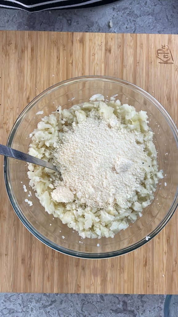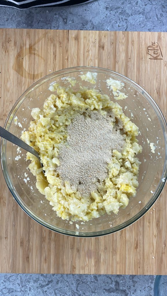 Hachez-le finement à la main avec un couteau ou dans un hachoir, mais attention à ne pas le réduire en purée.Assaisonnez le chou-fleur haché avec du sel, du poivre noir, de l’ail en poudre et une pincée de noix de muscade.