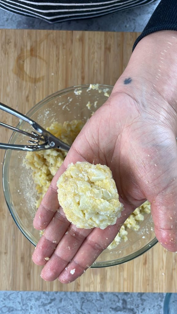 Formez les boulettes : prenez une cuillerée de pâte (pour les faire plus ou moins de la même taille, vous pouvez utiliser une cuillère à glace) et façonnez-la entre vos mains jusqu’à obtenir une forme ronde.