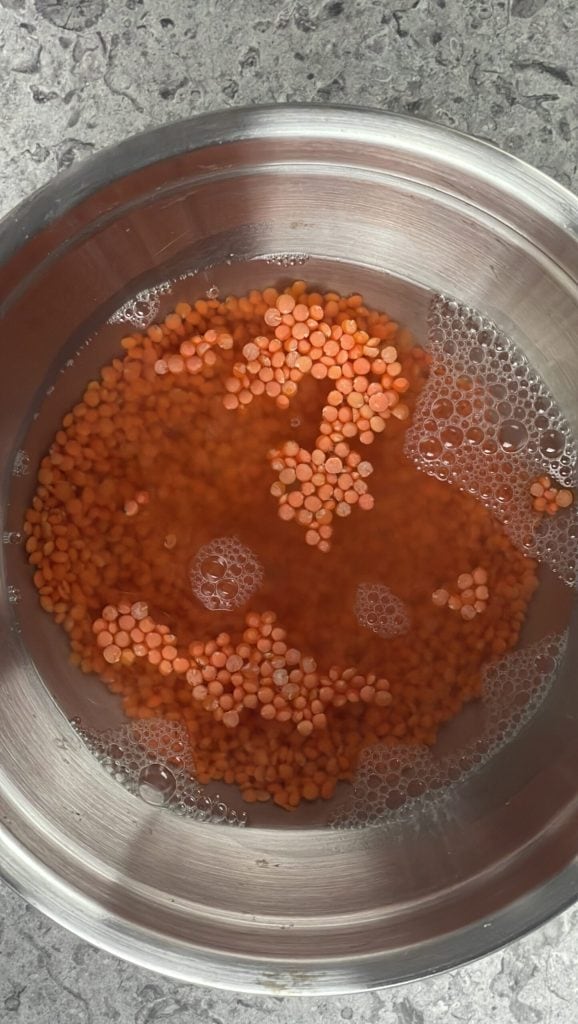 Commencez la préparation des boulettes de lentilles et carottes en rinçant les lentilles et en éliminant tout résidu de terre et petits cailloux.