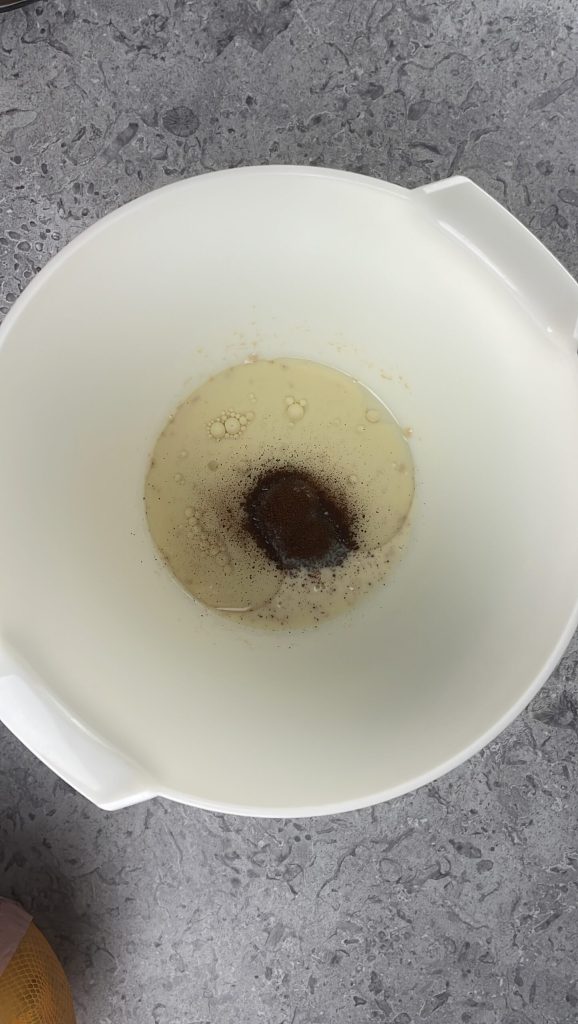 Ajoute également le sucre, l’huile, le café soluble et l’œuf légèrement battu.