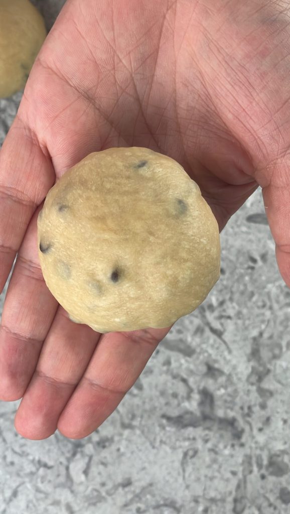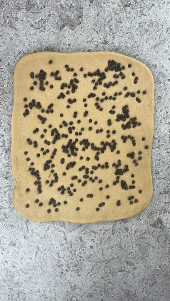Répartis les pépites de chocolat sur la pâte et appuie-les avec le rouleau pour qu’elles adhèrent bien.Divise la pâte en 8 parties avec un couteau ou un coupe-pâte.