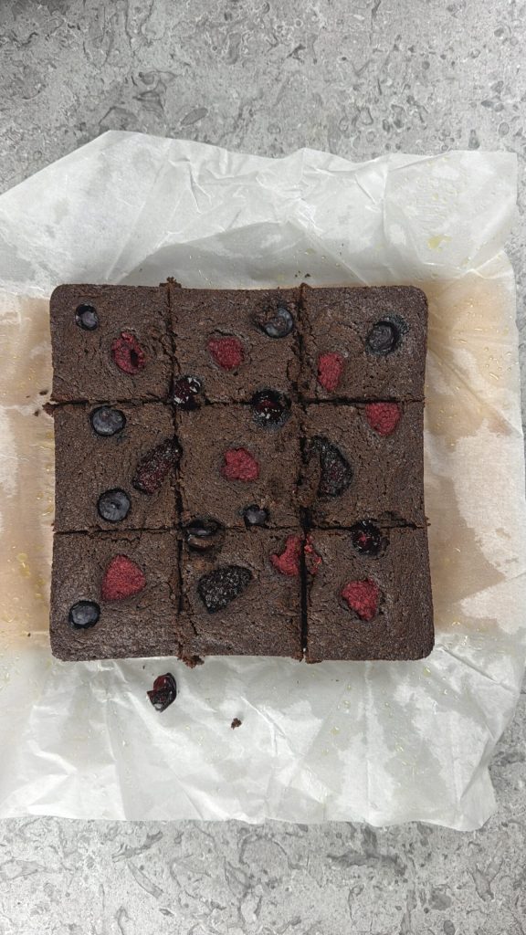 Le point fort de ces brownies au chocolat est la simplicité, les fruits des bois frais, ajoutés directement dans le moule avant d’enfourner, restent visibles en surface et donnent au dessert un aspect rustique et invitant.