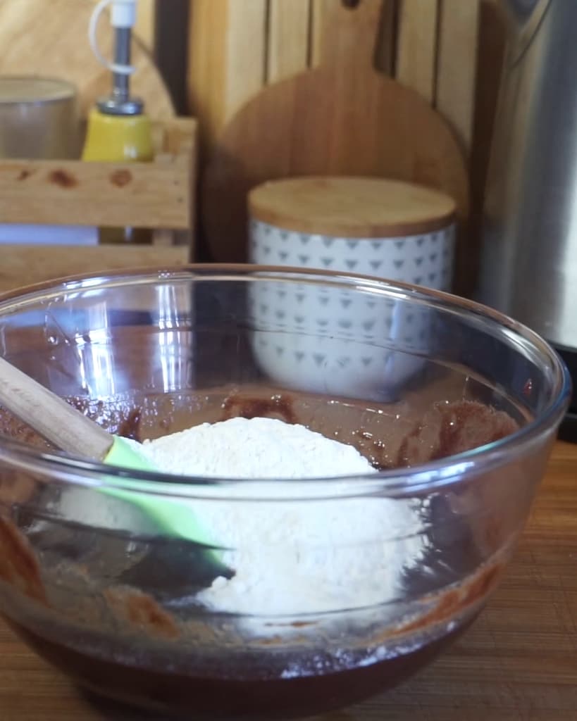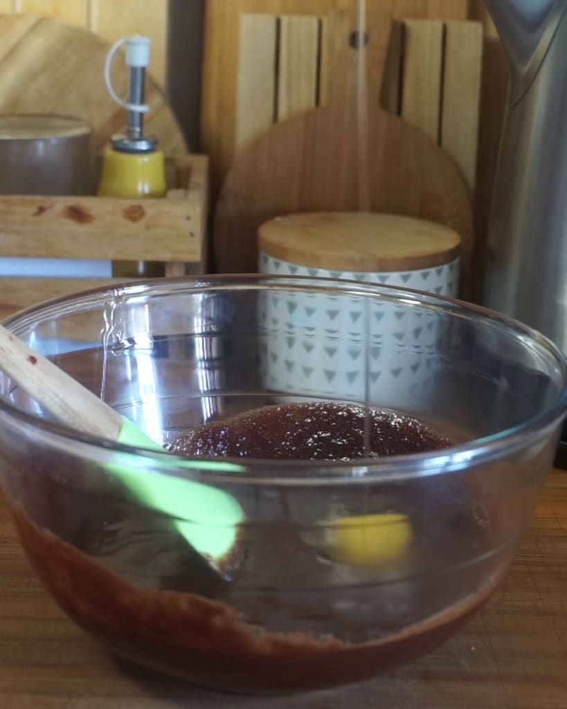 Commence la préparation des brownies marbrés à la citrouille avec la pâte au chocolat.