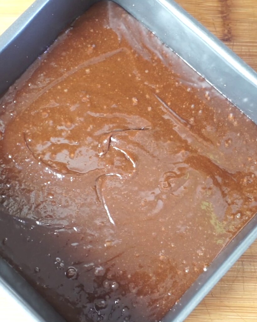 Transfère la pâte au chocolat dans un moule carré de 20 cm préalablement beurré ou recouvert de papier sulfurisé.