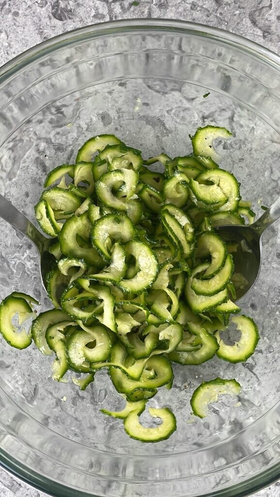Découpe-les finement avec une mandoline ou un spiraliseur et assaisonne-les avec du sel, du poivre noir et de l’huile d’olive extra vierge.