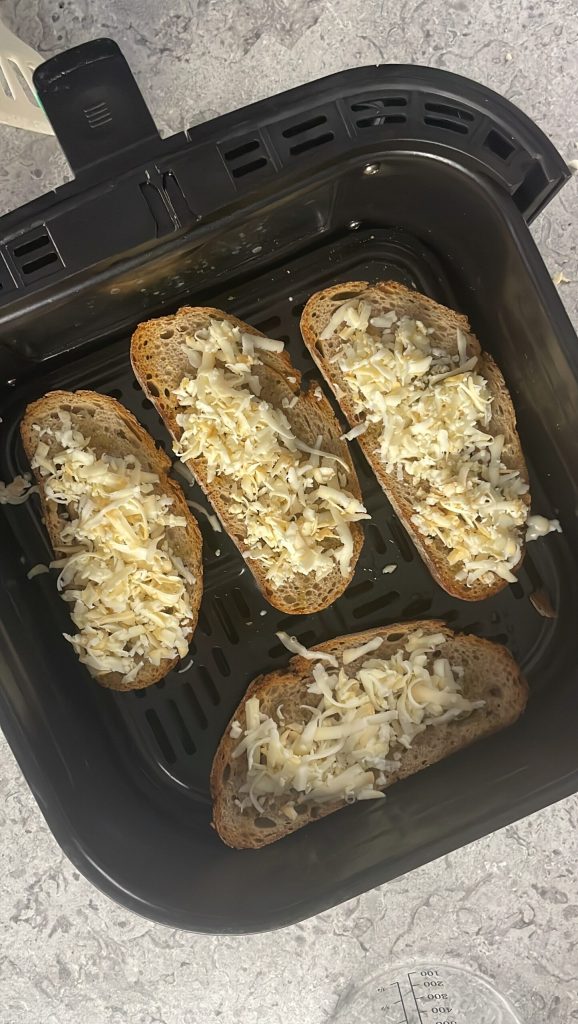 Tranche le pain et badigeonne-le d’huile. Fais-le griller au four à 200°C ou dans une friteuse à air à 180°C pendant 3 minutes.
