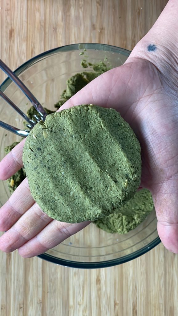 • Façonne les burgers : prends deux cuillères de pâte (pour les rendre tous égaux, j’ai utilisé un portionneur à glace), forme une boulette, puis aplatis-la entre tes mains pour former les burgers.