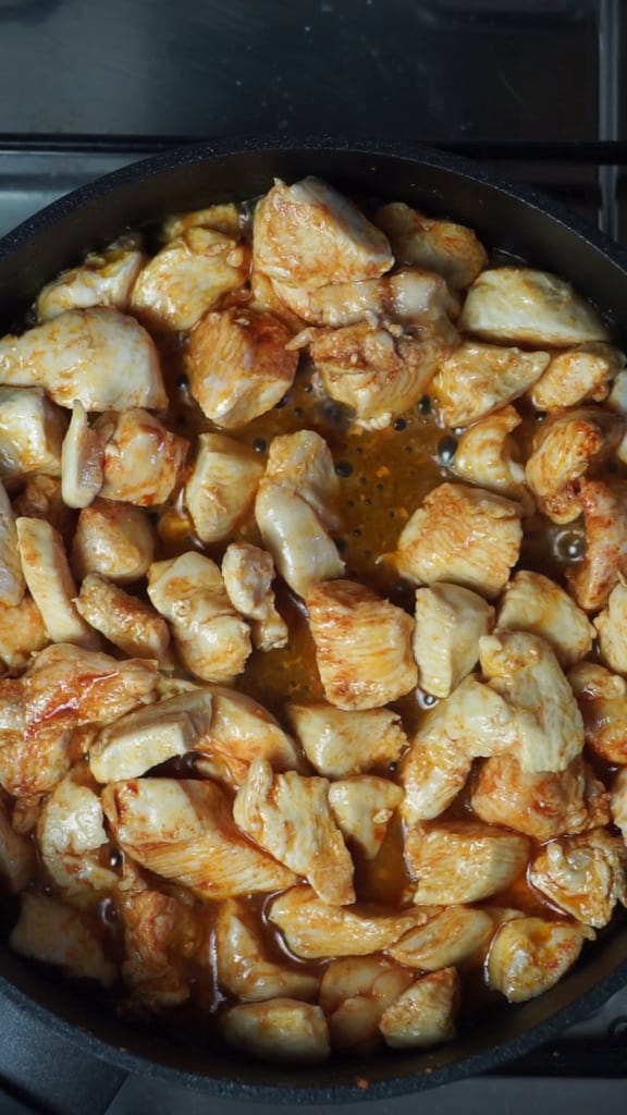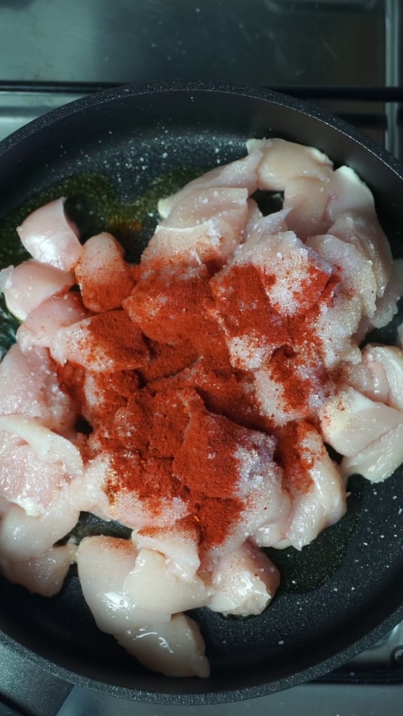 Chauffez une poêle avec deux cuillères à soupe d’huile d’olive extra vierge. Ajoutez le poulet et assaisonnez-le avec du sel, de l’ail en poudre et du paprika fumé.