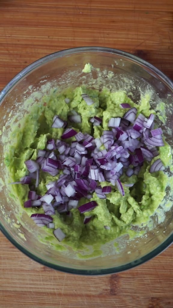 Ajoutez aux avocats écrasés un oignon rouge de Tropea finement haché et une pincée de sel.