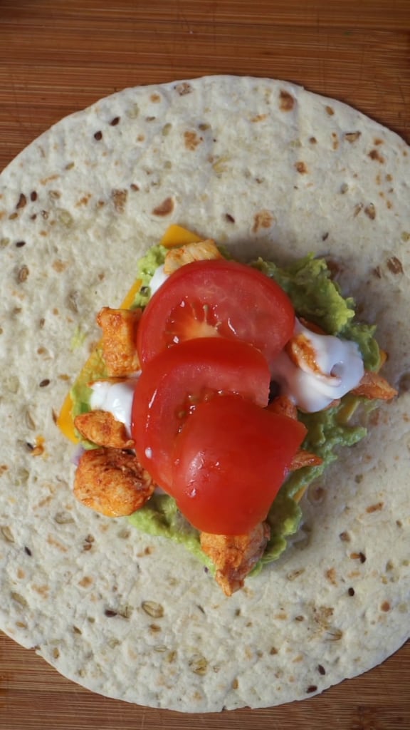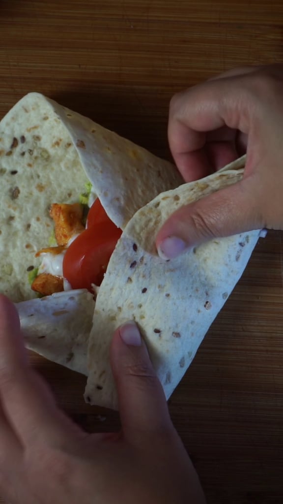 Roulez la tortilla en prenant soin de plier les côtés pour ne pas faire sortir la garniture.