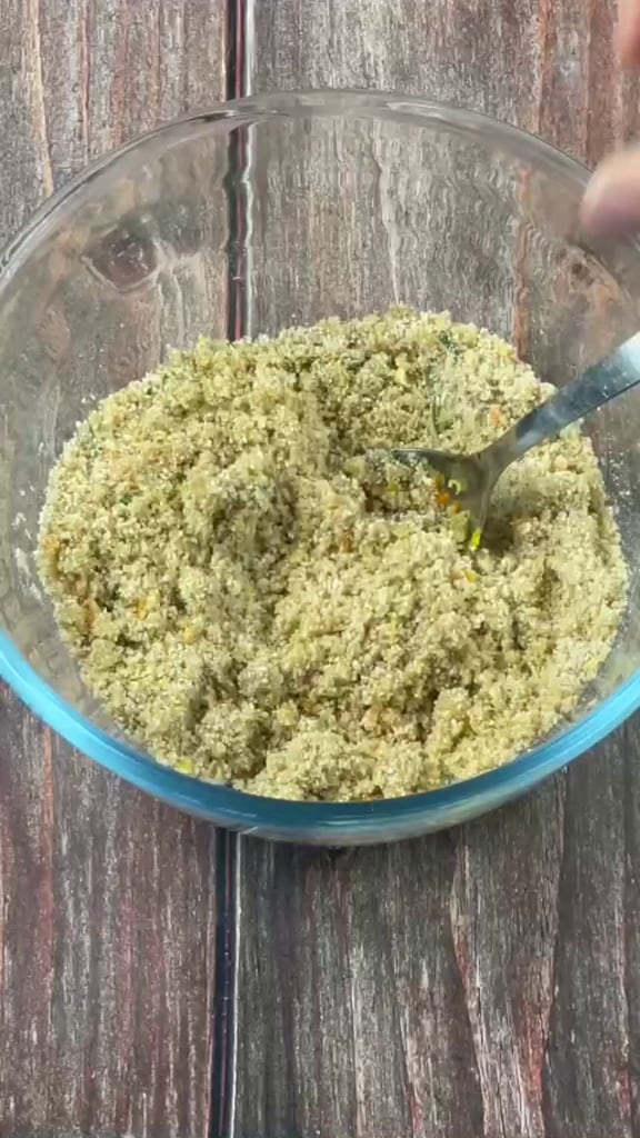 Mélangez à nouveau en ajoutant doucement de l’huile d’olive extra vierge : des sortes de miettes de chapelure doivent se former.