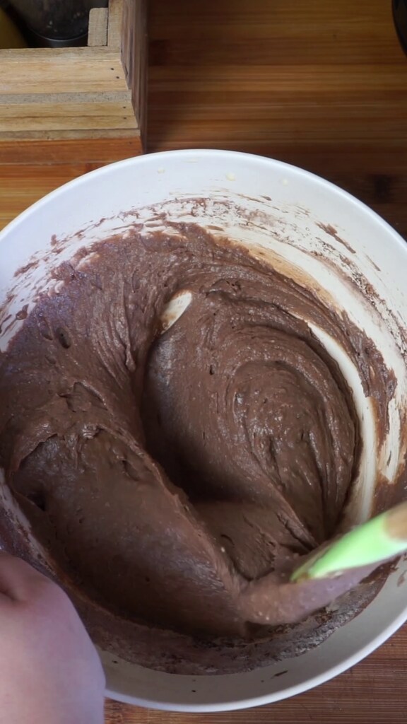 • Tamise également le cacao amer et ajoute-le à la pâte. Mélange le tout avec une spatule, si cela semble trop épais, ajoute un peu plus de lait.