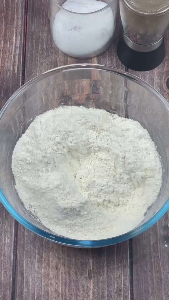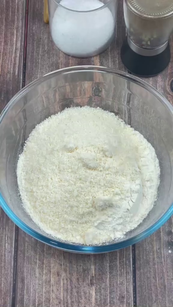Mettez dans un saladier la farine 00, la levure chimique pour préparations salées, le sel, le poivre noir et le parmesan râpé.