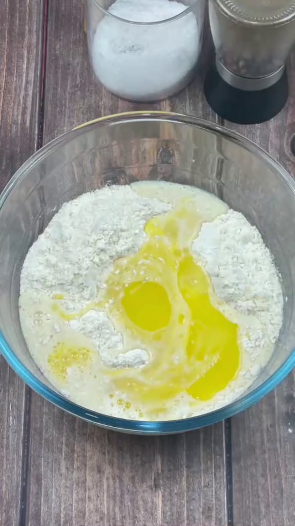 Ajoutez aux ingrédients secs le lait à température ambiante, le beurre fondu tiédi et un œuf battu.