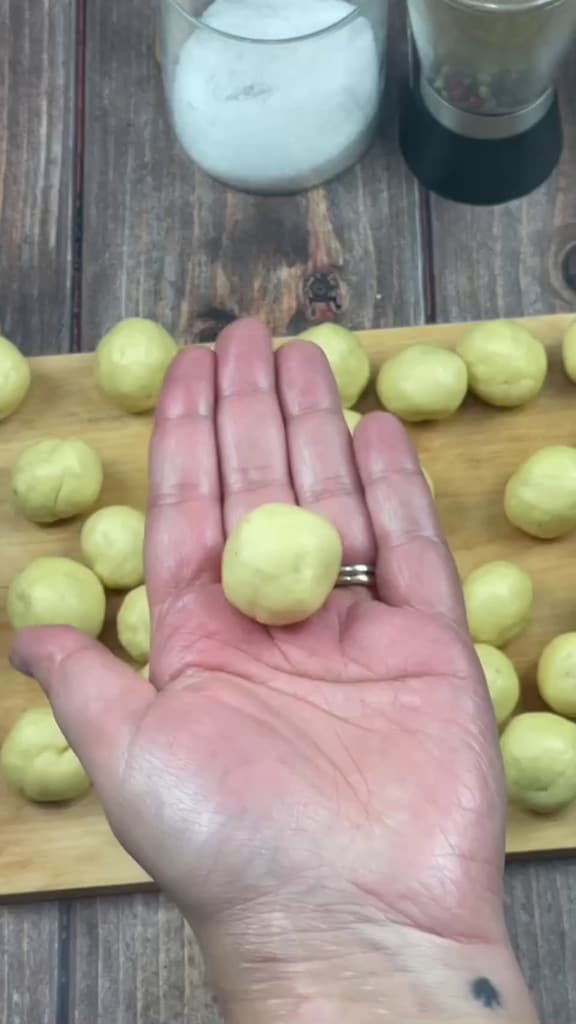 Divisez la pâte en 8 parts et formez quatre ou cinq boules de 3-4 cm de diamètre chacune.