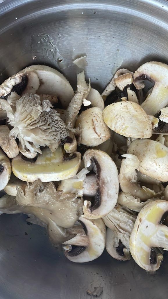 Mettez les champignons dans un bol et assaisonnez-les avec du sel et de l’huile d’olive extra vierge.