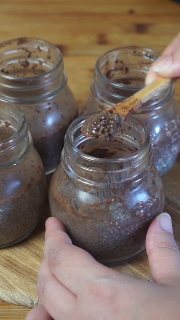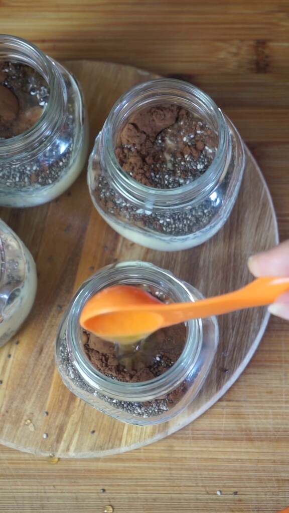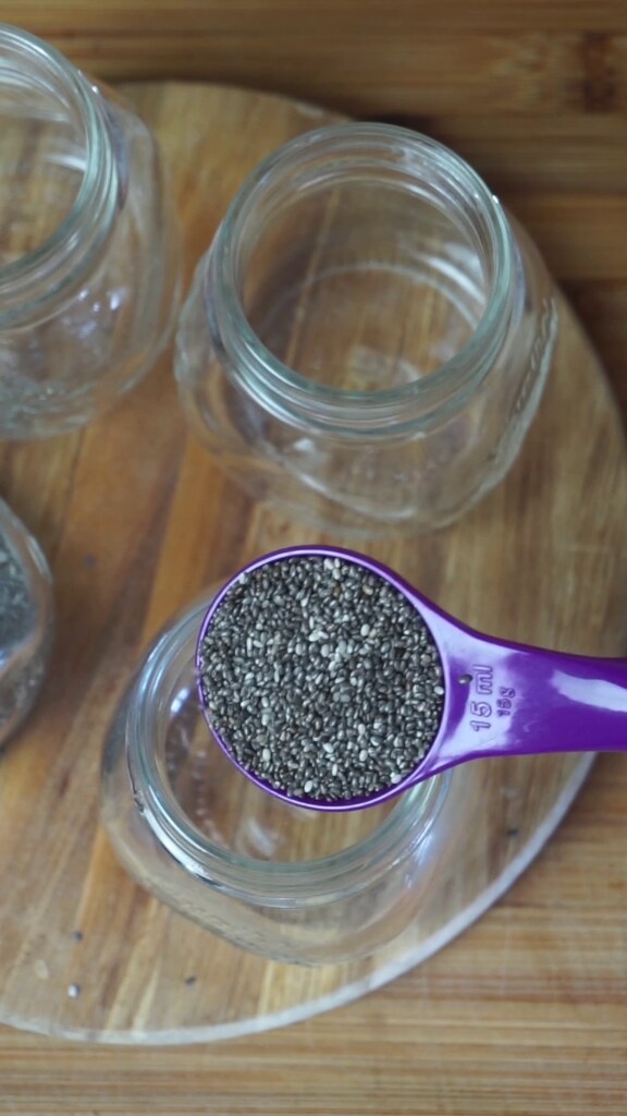 • Commencez la préparation du chia pudding au cacao en mettant dans un petit bocal 2 cuillères de graines de chia.