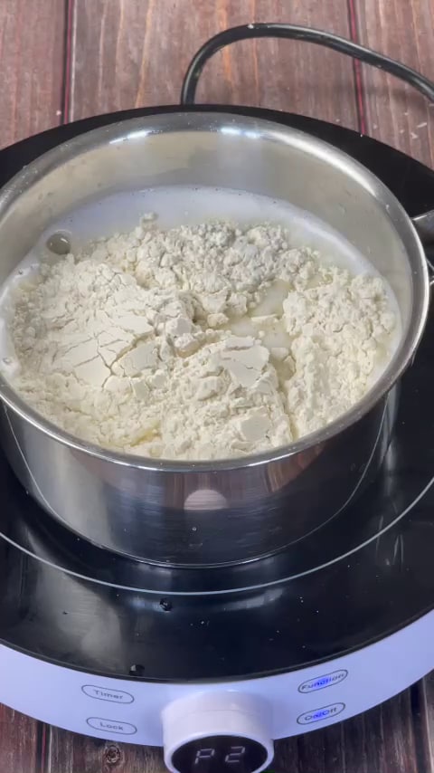 • Continuez la préparation en ajoutant la farine 00 : mélangez bien jusqu’à obtenir une pâte ferme qui se détache des parois de la casserole.