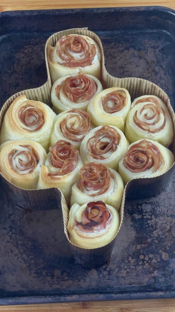 La colombe en pâte feuilletée est une recette très facile à réaliser et parfaite pour être servie en entrée ou en apéritif pendant la période pascale. Et pourquoi pas, aussi comme centre de table à thème pour le déjeuner de Pâques. Il s’agit simplement de roulés de pâte feuilletée farcis – dans mon cas – de fromage à tartiner et de salami de Naples disposés en forme de colombe grâce au moule approprié et cuits dans celui-ci pour obtenir un plat parfaitement thématique !