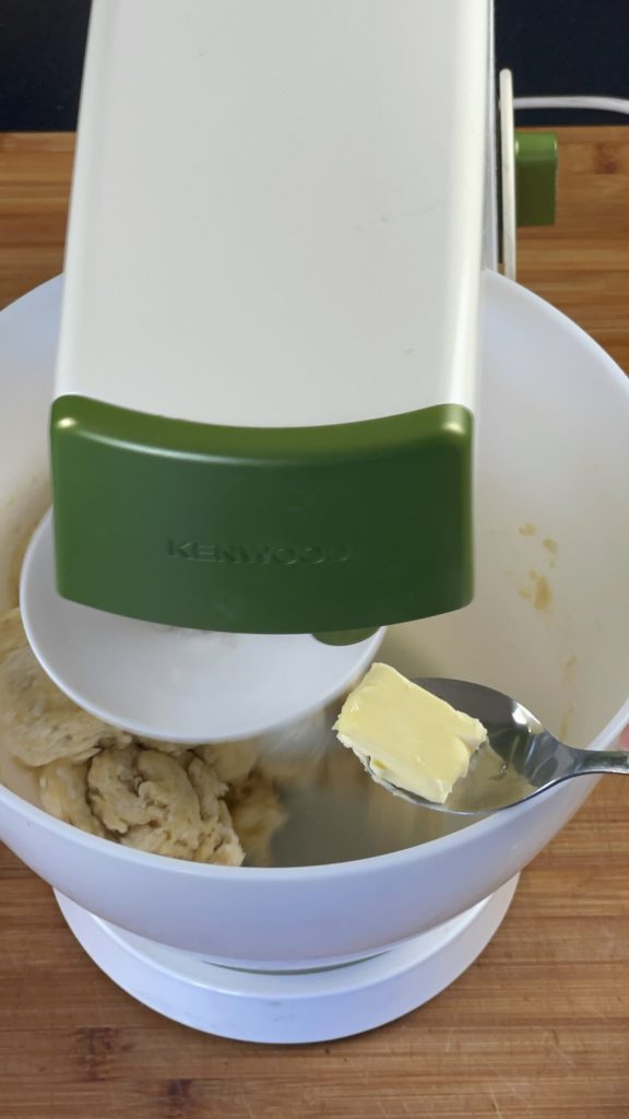 Commencez à pétrir avec le crochet à spirale à vitesse modérée.Quand la pâte commence à prendre forme, ajoutez le beurre mou petit à petit.
