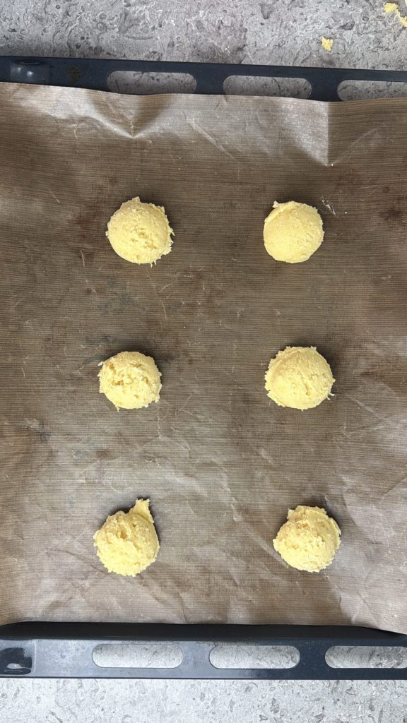 • Prends la pâte avec une cuillère à glace et dépose-la directement sur la plaque du four (recouverte d’un tapis ou de papier sulfurisé). Place les boules de pâte bien espacées, pas plus de six à la fois.