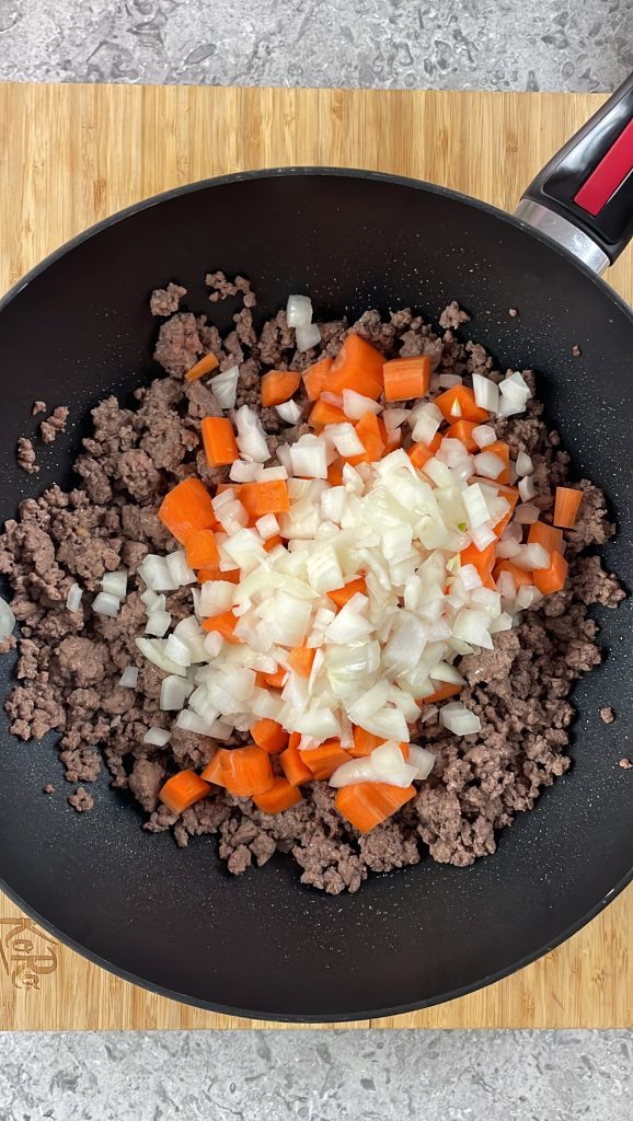 Ajoute la viande hachée et fais-la bien colorer.Pendant ce temps, lave, épluche et hache l’oignon et les carottes.