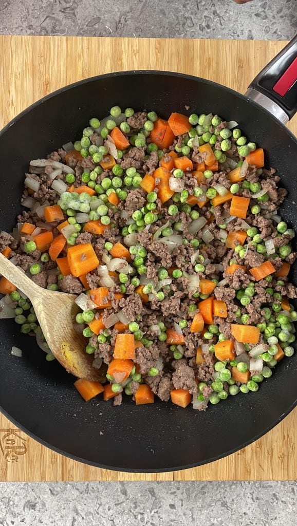 Mets-les dans la casserole avec la viande hachée et laisse cuire encore 5 minutes.Ajoute également les petits pois.