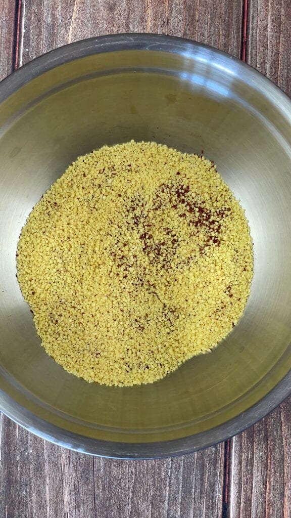 Fais bouillir de l’eau dans une casserole ou avec une bouilloire (alternativement, vous pouvez préparer un bouillon de légumes). Sale l’eau et verse-la dans le bol avec le couscous en le couvrant complètement.