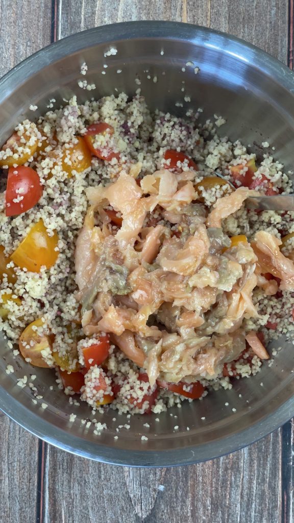 Couscous au saumon et tomates cerises, une recette qui allie saveurs fraîches et méditerranéennes avec une touche exotique des épices.