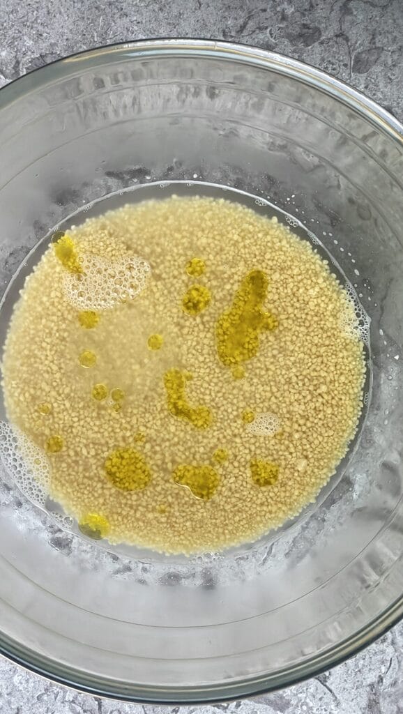 Pesez le couscous dans un bol et couvrez-le avec le même volume d’eau bouillante salée et une cuillère à soupe d’huile d’olive extra vierge.