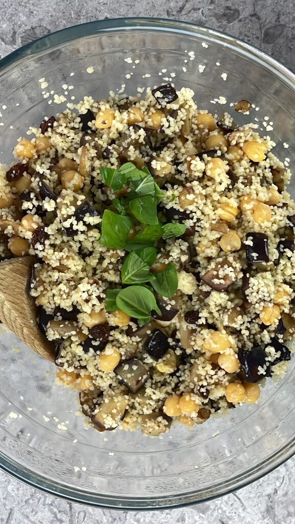 Assaisonnez le couscous avec les aubergines cuites avec les raisins secs, les pois chiches assaisonnés et quelques feuilles de basilic.