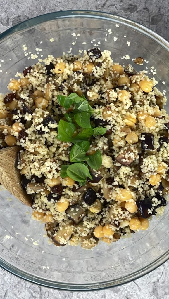S’il est trop sec, ajoutez plus d’huile.Assaisonnez le couscous avec les aubergines cuites avec les raisins secs, les pois chiches assaisonnés et quelques feuilles de basilic.