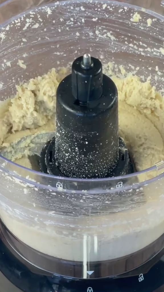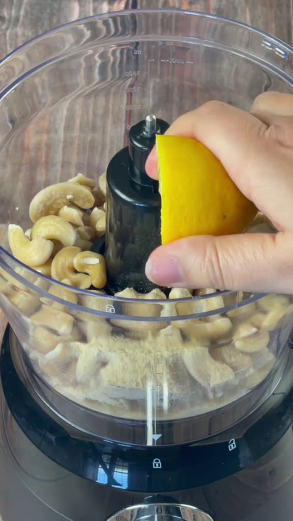 Transfère les noix de cajou dans le robot de cuisine et ajoute le sel, l’ail en poudre et la levure alimentaire.