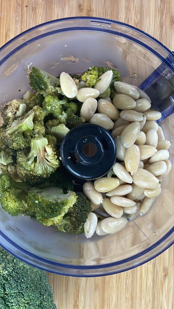 Égouttez les amandes et mettez-les dans le mixeur avec les brocolis.