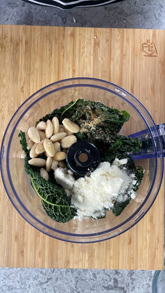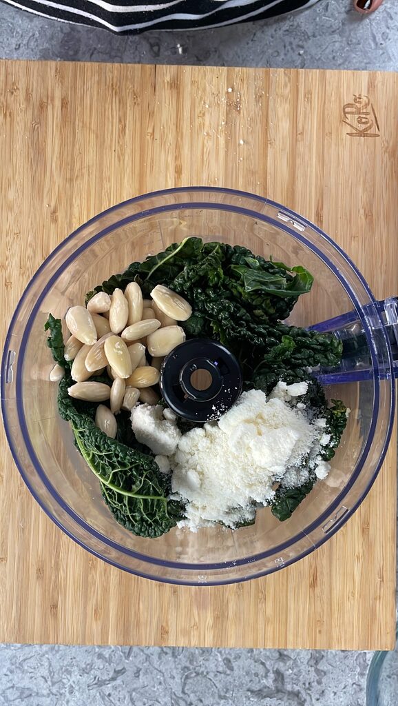 Mettez les amandes et le chou noir dans le bol d’un mixeur ou d’un robot de cuisine.
