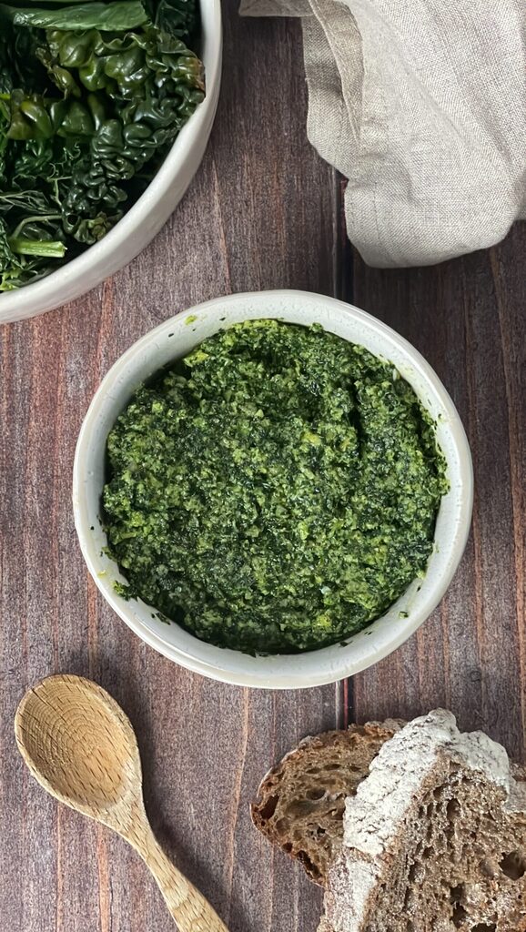 Transférez la crème de chou noir et amandes dans un petit bol et servez-la à table.