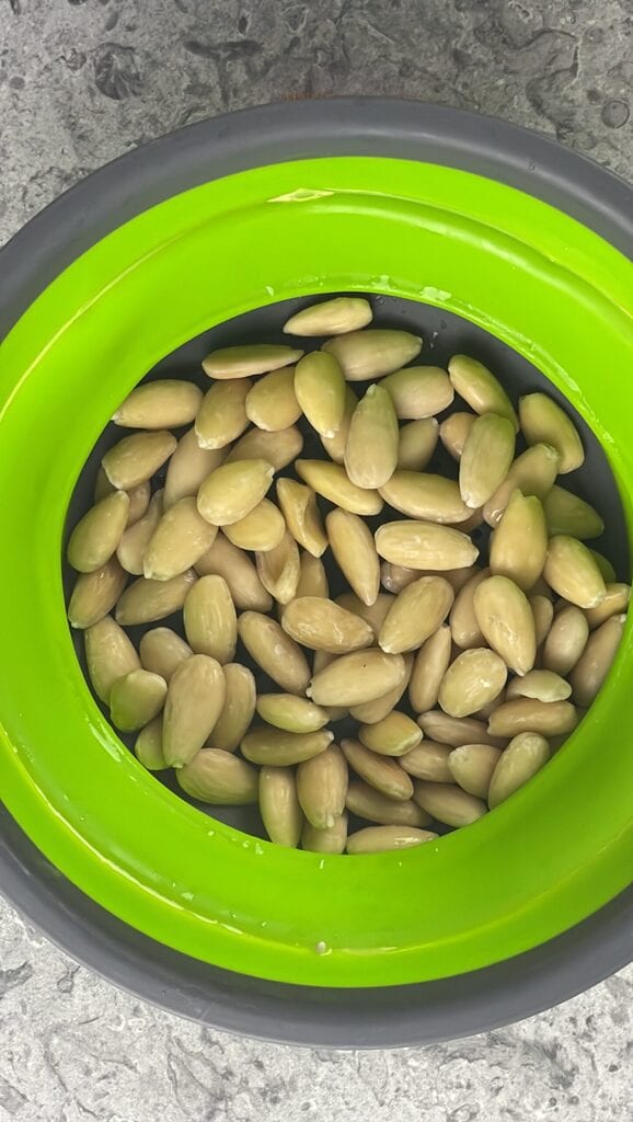 Commencez la préparation de la crème de courgettes, amandes et basilic en faisant tremper les amandes dans de l’eau pendant quelques heures.