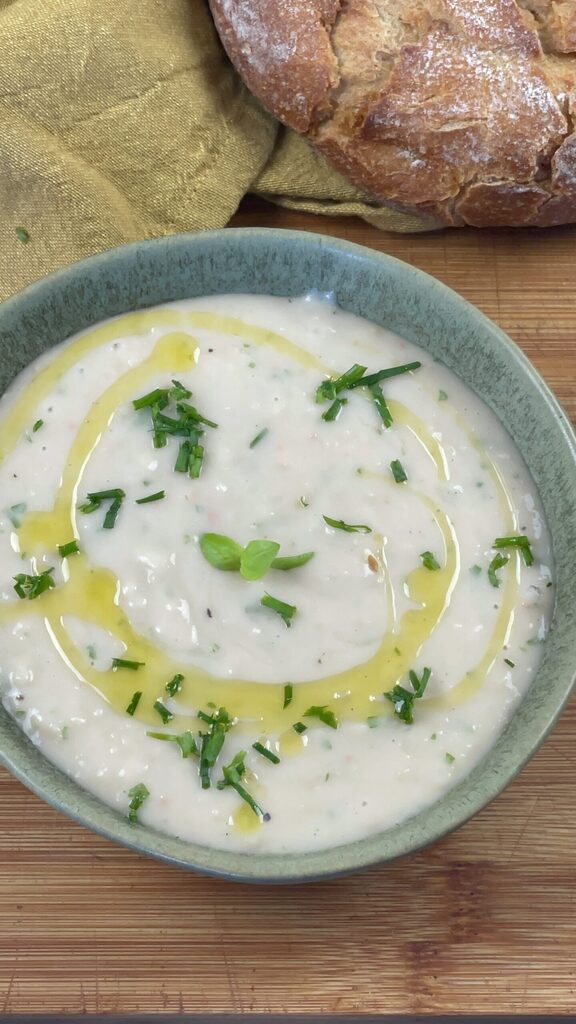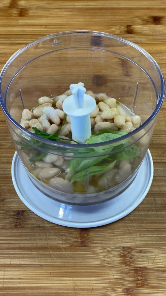 Transférez la crème de haricots et basilic dans un petit bol et terminez la préparation en ajoutant encore un peu de ciboulette et de basilic et un filet d’huile d’olive extra vierge.