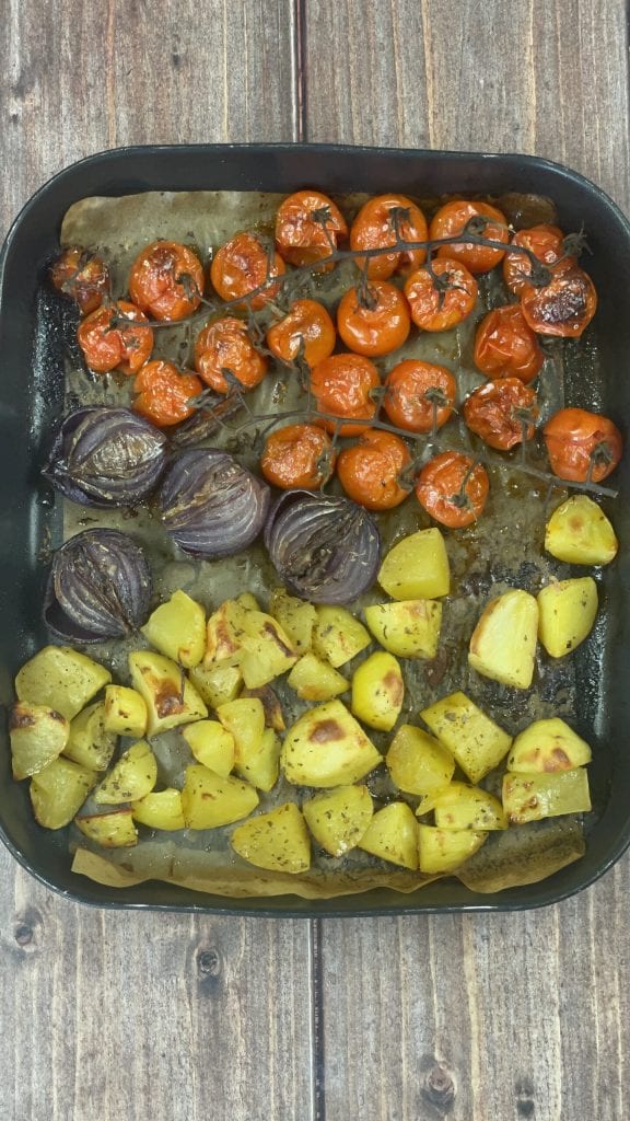 Lavez également les tomates cerises et disposez le tout sur un plat ou un plat à gratin recouvert de papier cuisson ou du tapis en silicone réutilisable approprié.Assaisonnez les légumes avec du sel, du poivre noir, de l’origan séché et deux cuillères à soupe d’huile d’olive extra vierge.