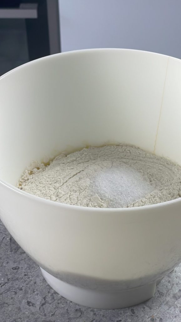 Commencez la préparation des croissants salés de pan brioche en mettant dans le bol du robot pâtissier le lait et en versant la levure de bière sèche en pluie.