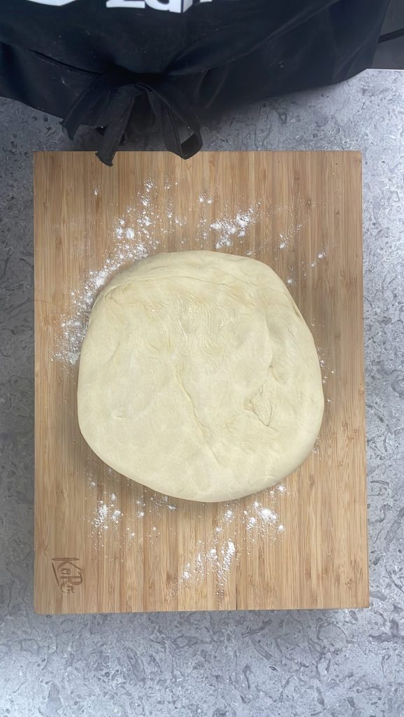 Transférez-la sur un plan de travail légèrement fariné, formez une boule et laissez-la lever jusqu’à ce qu’elle double de volume.Reprenez la pâte levée, aplatissez-la et étirez-la légèrement avec les mains.