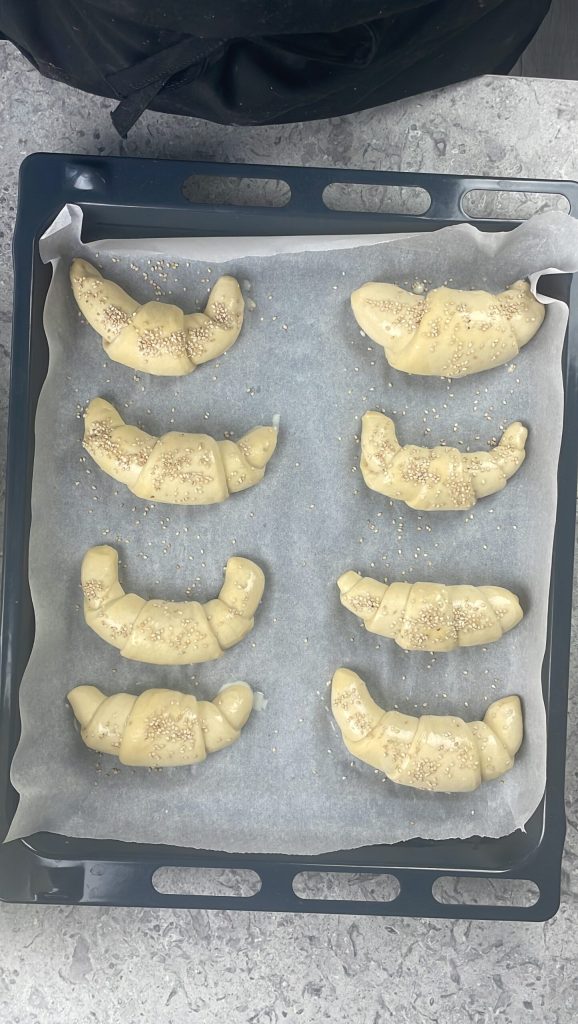 Laissez reposer les croissants sur la plaque de cuisson (recouverte de papier sulfurisé) pendant une heure.Badigeonnez les croissants avec le lait et saupoudrez-les de graines de sésame.