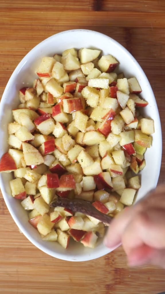Ajoute aux pommes une pincée de cannelle, le sucre de canne et 20g de beurre fondu : mélange bien jusqu’à ce que tous les ingrédients soient bien incorporés.