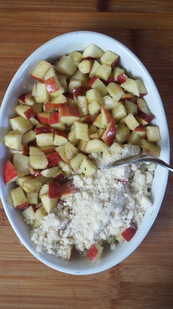 Répartis le crumble préparé précédemment sur les pommes en veillant à bien les recouvrir complètement.