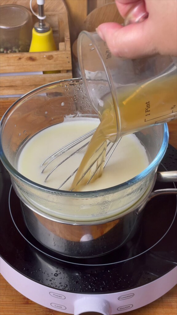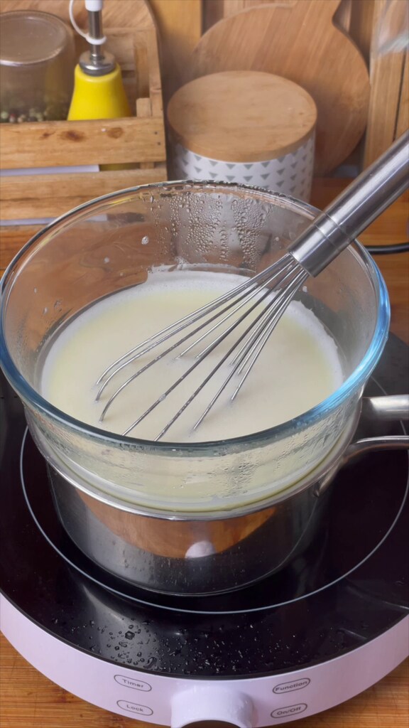 Transfère le bol sur une casserole avec de l’eau bouillante et cuis en mélangeant toujours pendant 3-4 minutes, le mélange doit légèrement s’épaissir et la crème doit napper la cuillère.
