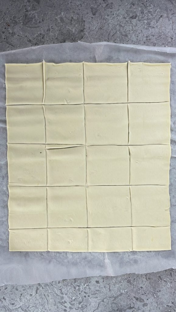 Commence la préparation des feuilletés au saumon et à l’avocat en coupant le rouleau de pâte feuilletée en carrés d’environ 7 cm de côté.