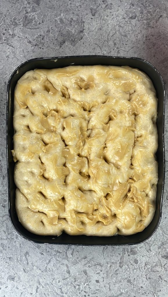 La base est préparée avec de la farine Manitoba, du lait, du sucre de canne et une pincée de cannelle en poudre, qui donne immédiatement un arôme chaud et enveloppant. Après la levée, la pâte est cuite au four à 200°C pendant environ 20 minutes, obtenant une focaccia dorée et moelleuse. Pour la rendre encore plus gourmande, elle est recouverte d’une couche crémeuse à base de beurre mou, de sirop d’érable et de cannelle, qui fond légèrement à la surface pendant la cuisson, laissant la focaccia humide, douce et parfumée.