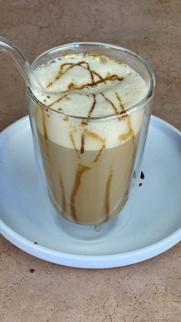 Cette boisson est caractérisée par un mélange de café, de glace, de sirop de caramel et d’une base sans lactose, qui peut être une boisson au soja – comme dans ce cas – à l’amande, à l’avoine ou encore à la noix de coco.