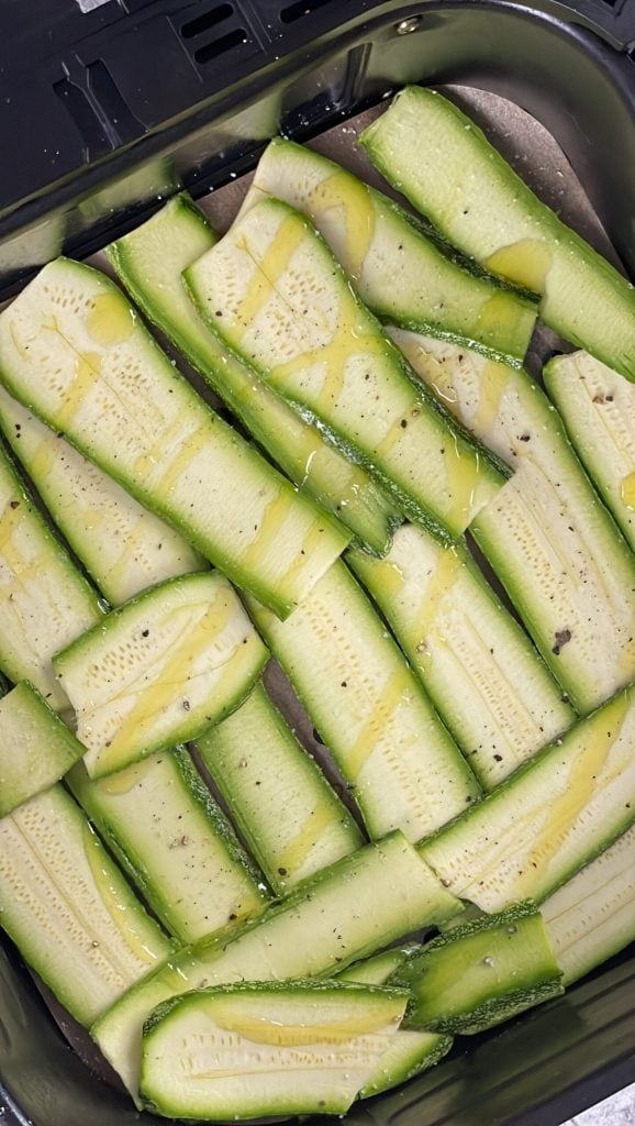 Tranchez-les finement avec un couteau ou une mandoline.Assaisonnez les courgettes avec du sel, du poivre noir et de l’huile d’olive extra vierge.